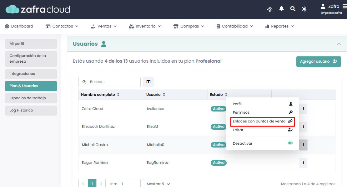 Ubicaremos el usuario que deseamos configurar, daremos sobre los tres puntos y luego en “Enlaces con puntos de venta”