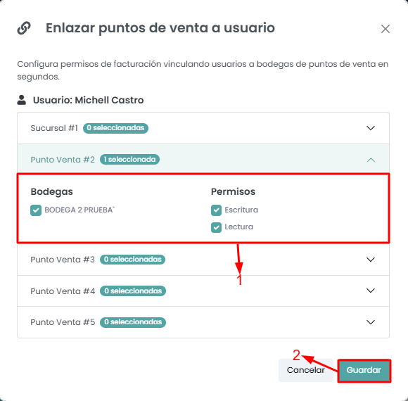 También escogerás la bodega y los permisos para escritura/lectura a las cuales tendrá acceso el usuario.