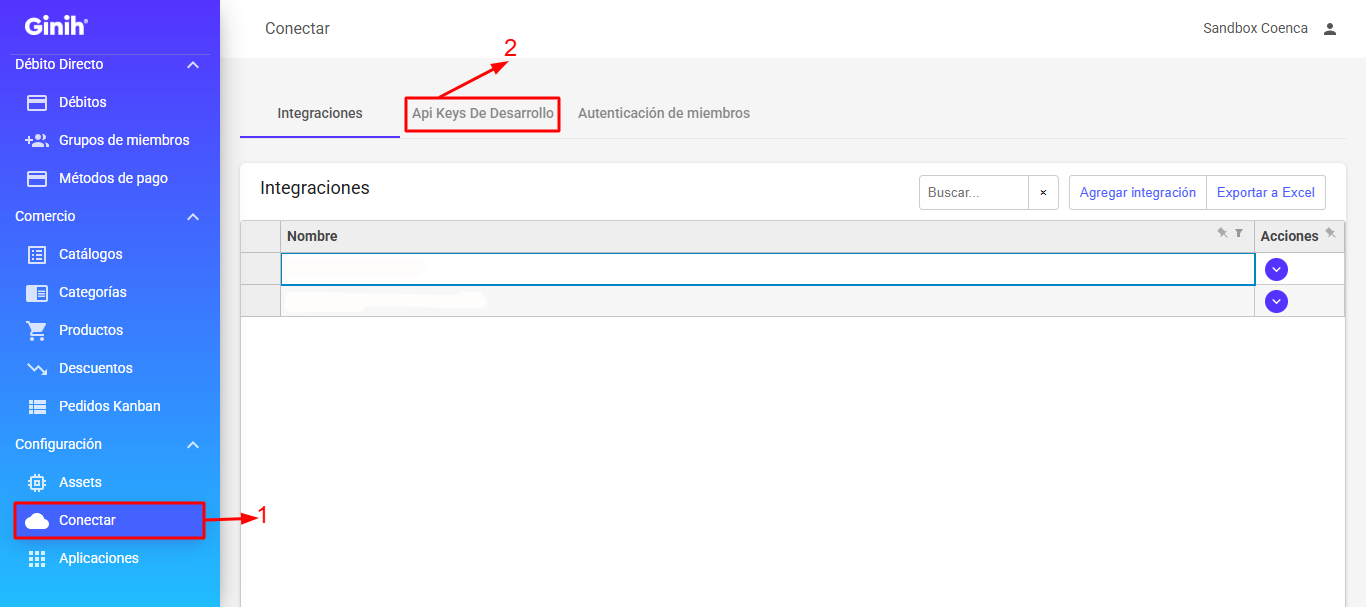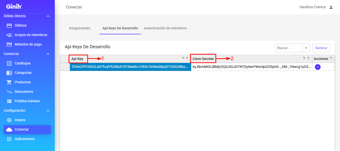 Para esto, inicia sesión en GINIH, presiona sobre conectar y luego API keys de desarrollo.